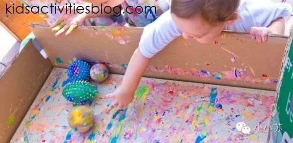 纸箱是艺术启蒙的好工具,因为它本质上是一片空白,可以给孩子们提供颜料,在纸箱里自由发挥自己的想象:
