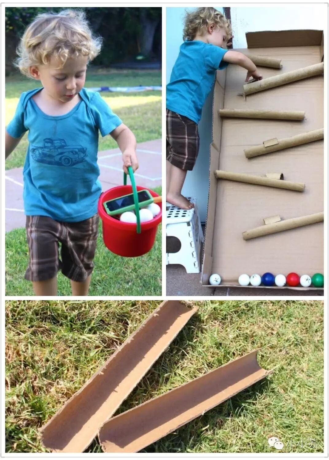 把家用厨房纸巾的芯对半剪开,变成“通道”,粘合在一个长方形纸箱的内部,加上高尔夫球、玩具球或者各种颜色的乒乓球,就变成了“迷宫”