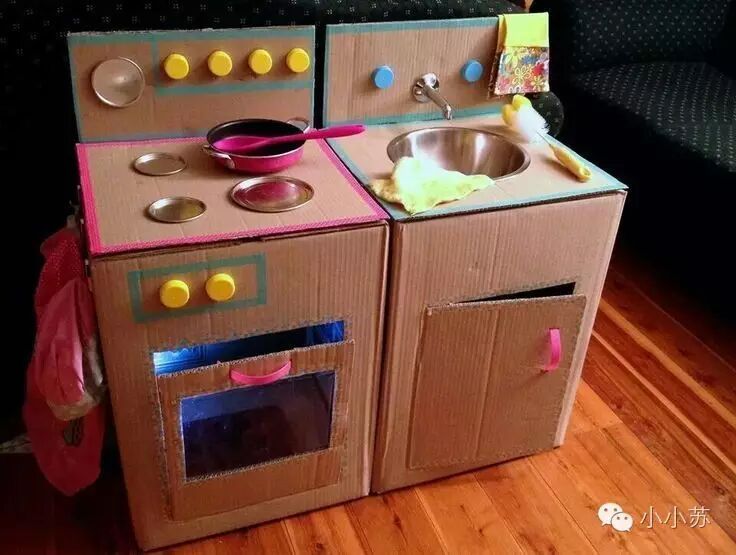 这对爹妈脑洞大开的把纸箱子做成了宝宝的玩具厨房: