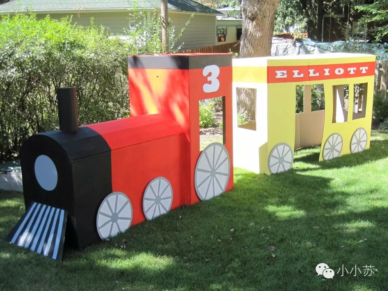 如果你家宝宝喜欢玩具小火车,还可以用纸箱子打造一个迷你“车站”: