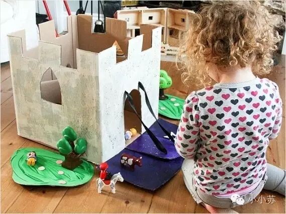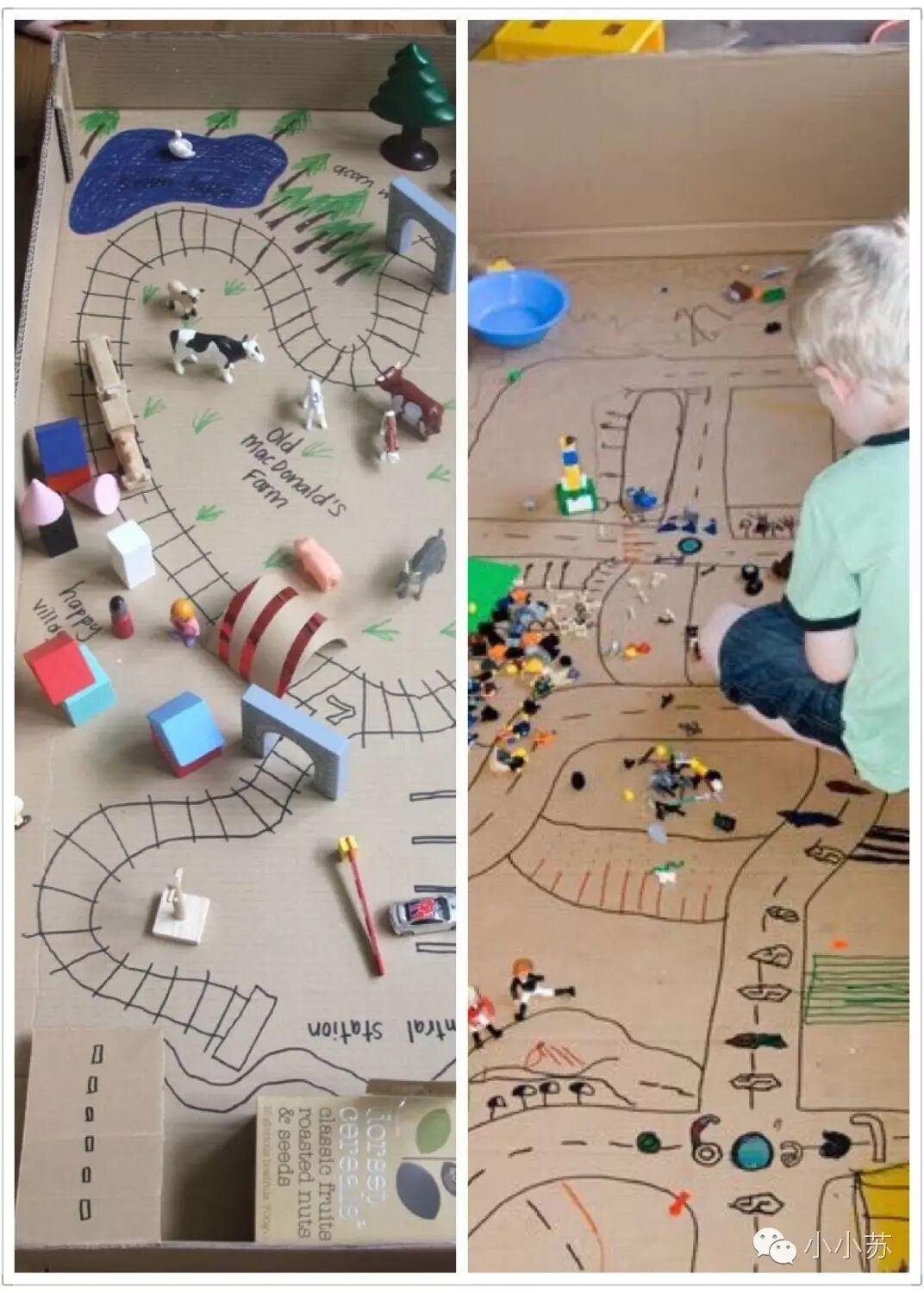很多孩子都有小车模型和积木,在纸箱子里画上自己设计的“道路”,就把纸箱变成了一座城市,可以让孩子们的想象力自由驰骋: