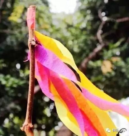 比如用枯树枝,系上几根彩色纸条,娃就可以迎风飞扬啦。