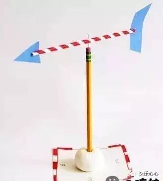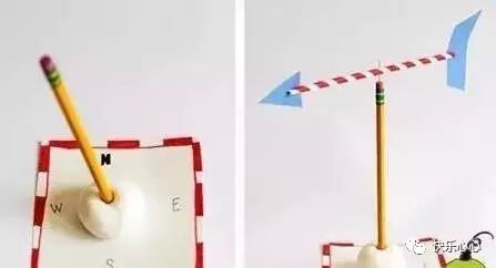 然后准备一张纸,写上东西南北,这就是罗盘了。在中间放一个粘土,插上铅笔(带橡皮头的),用大头针将吸管固定在笔头,风向标就做好了。