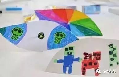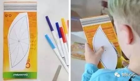 当然还可以在风车上画图案,而且还是对称图案的,涂出来很有艺术范。参照素材下面的示例,在空白部分创作,将对角线剪开后,将阴影部分的纸向中心对折,就能完整展现涂好的画面。