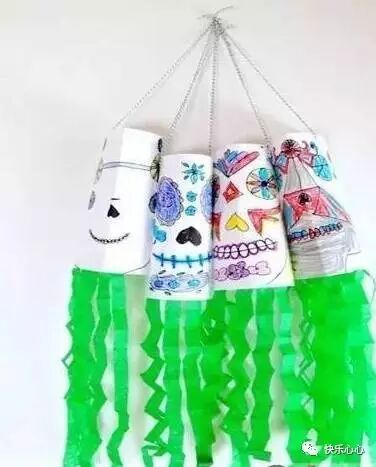 给怪物们涂好颜色后,就可以给它们贴上“胡子”了,就是风筝的尾巴,使用皱纹纸,飘起来的效果会更好,可以使用1种颜色的,也可以混搭。