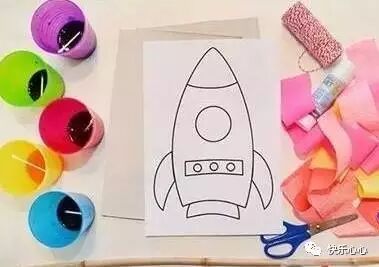 将火箭上好颜色后,将它粘贴到硬纸板上沿线剪下来,再把彩纸粘贴在火箭的尾部就可以了。