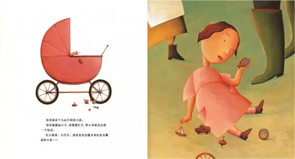 故事的开始,婴儿的一只小手伸出了婴儿车,地上散落了一些玩具。,它色彩饱满,像是被切去了四分之一的蛋糕。画家仿佛在用变形和色彩暗示出这是一个神奇的故事。