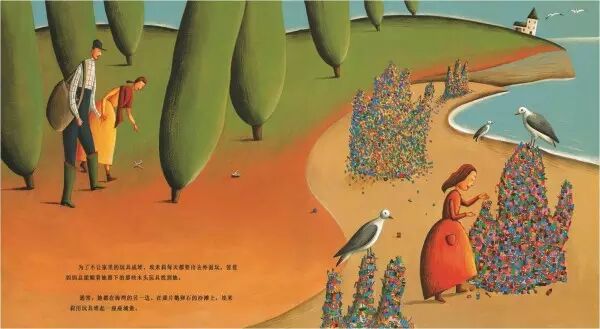尽管埃米莉有无数的玩具,细心的读者会发现她的脸上一直没有笑容。她的第一次灿烂笑容是在什么时候出现的呢?当埃米莉站在成堆的玩具上,喂天空中飞过的海鸟的时候,她笑了。她的脸蛋在沙滩和海面的背景对比下显得那么小,但是我们谁也不会错过这个绽放的笑容。画家为了这个笑容,给埃米莉配上了一个不同于其它场合的发型。海鸟停在了埃米莉的掌心,也许,就在这一刻,埃米莉明白了什么才真正能令她快乐。