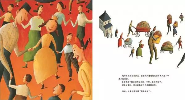 所以,翻到下一页,意料之外,也是意料之中,我们正面看到了埃米莉的笑脸。,与大家牵着手舞蹈。这与其说是在庆祝埃米莉的七岁生日,不如说是在酝酿埃米莉新人生的开始。宴会结束的时候,所有被邀请的人都抱着一大堆玩具满载而归。从埃米莉被称为“玩具女孩”的那一刻开始,她其实已经有了故事最后的另一个名字。