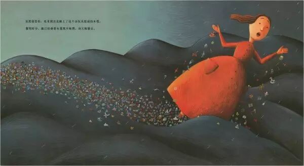 画家在这个环节上的人物设置显然是经过推敲的。埃米莉要拯救的是自己的父亲,而不是什么陌生人。这样的设置非但不会削弱埃米莉的形象,反而增加了故事真实、感人的力度。一个孩子,要她选择为一个陌生人舍弃一切未免苛刻。只有对象是自己的亲人,一切的不可能才显得理所当然。这时,我们绝不会质疑一个孩子到底有没有这样的勇气面对疾风大浪;我们也不会质疑埃米莉这样的举动是不是太大胆。一切的质疑在埃米莉辽阔的心的面前烟消云散。我们恍然明白:从头到尾,画家的装饰性风格要装饰的不是这个故事,而是人物的心灵;同样,饱满的画面,饱满的也实际是人物的情感。
