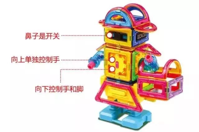 Magformers(麦格弗)益智磁力片行走机器人开关就是它的鼻子,每次开启的同时眼睛还会发出蓝色的亮光,胸前的开关可以控制手以及脚的行走。