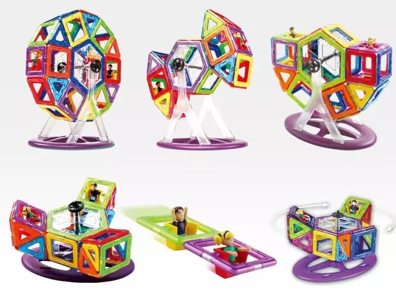 摩天轮这套磁力片组合,拥有46片不同的磁力片,比如三角形、正方形、圆形等等,相信转动的摩天轮,会非常吸引孩子,并且通过感知刺激和手指运动,能够促进孩子的大脑和神经系统发育。