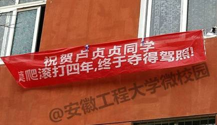 1日,@安徽工程大学 一女生宿舍拉出一条横幅:“祝贺卢贞贞同学摸爬滚打四年,终于夺得驾照!”。采原来,卢同学本人学车四年,寝室最早报名,也是最迟拿到驾照,室友偷偷为其拉起横幅庆祝。卢同学说有这么一群暖心的戏精室友,很感动,很贴心!