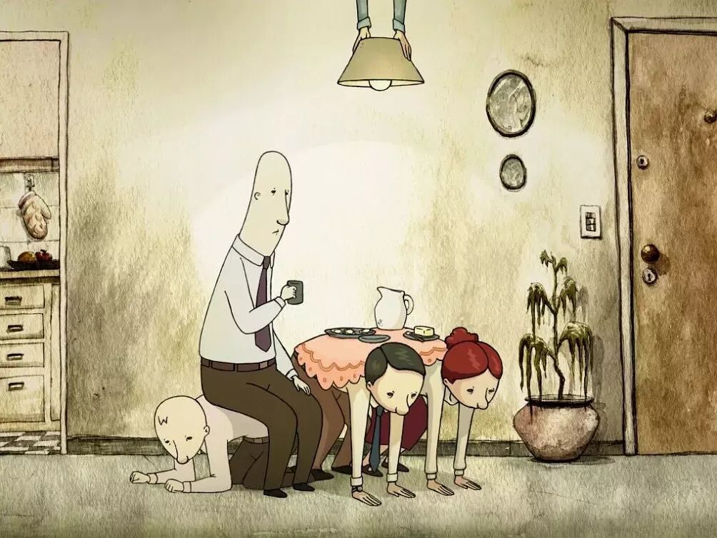 清晨七点一刻,闹钟大作,秃头的中年男人极不情愿地按掉闹铃,颇显疲惫地起身洗漱。他的房间颇为奇怪,无论是地灯、梳妆台、餐桌、椅子还是衣架,都由人来担任。这些人面无表情,兢兢业业地做好自己的事情。男子穿好衣服出门,并雇了一个人力出租车赶赴单位。在这个神奇的世界,所有的工具都有人来完成,他们毫无怨言,组成了这个冷酷的世界重要的一部分……