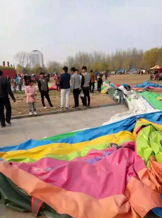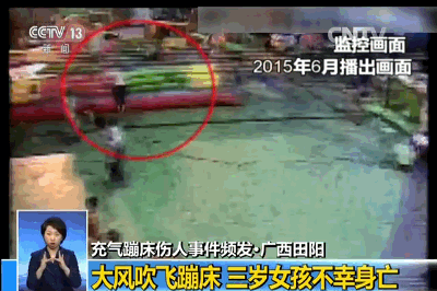 大风将气垫蹦床吹走,蹦床上的孩子随着气垫蹦床被风吹到了空中后落到地下,其中一名小女孩抢救无效死亡。