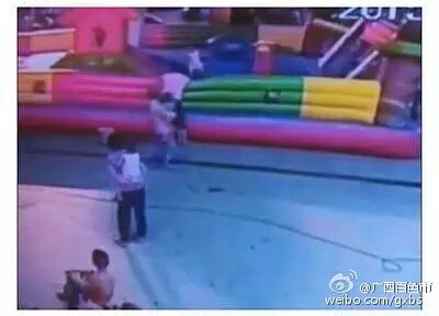 周四(4日)晚,在广西百色市田阳县城内,一名3岁小女孩正在充气的“蹦蹦床”上愉快玩耍,突然一阵大风将“蹦蹦床”吹到了空中,随后小女孩被重重摔下,小女孩经抢救无效死亡。
