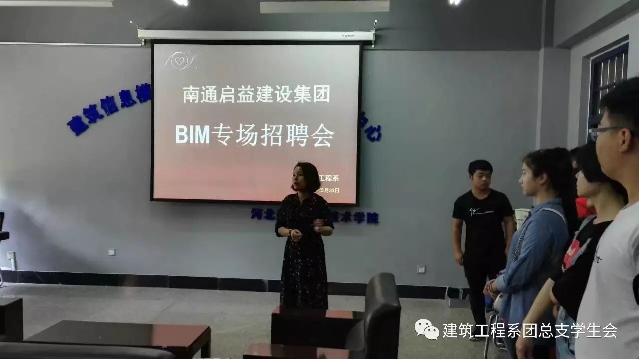 6月3日,建筑工程系建筑信息模型(BIM)技术应用研究中心携手南通启益建设集团(北京分公司)共同举办了BIM人才专场招聘会。此次南通启益建设集团(北京分公司)招聘岗位人员主要有BIM项目经理、BIM土建工程师、BIM结构工程师、BIM设备工程师。会前集团公司与技术中心计凌峰、王岩、杜秉旋、于侃四位老师进行了深入交流,充分了解了技术中心培养模式及培养方向,随后技术中心小组成员及订单班学员向集团公司展示自己的成果,通过成果展示及交流公司从应聘学生中选拔出5名进入公司实习,会后集团公司徐总对学员的BIM建模、设计与技能应用能力给予高度评价,表示今年年底还会继续到我院选拔优秀BIM人才。