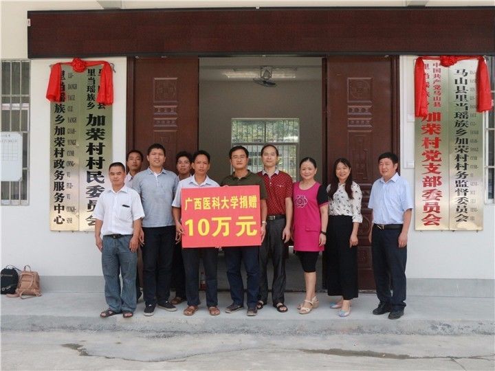 里当瑶族乡加荣村也收到了后援单位同样的爱心,广西医科大学领导到驻点村里当瑶族乡加荣村开展调研,了解里当土鸡养殖合作社、竹鼠养殖合作社和黑山羊养殖大户等帮扶产业的发展情况,还给加荣村带来了价值10万元的扶贫资金和物资,帮助加荣村启动和发展产业、改善村委和公共服务中心基础设施建设,解决加荣村教学点的孩子们冬天热水洗澡问题,并开展送被子等温暖助学活动。
