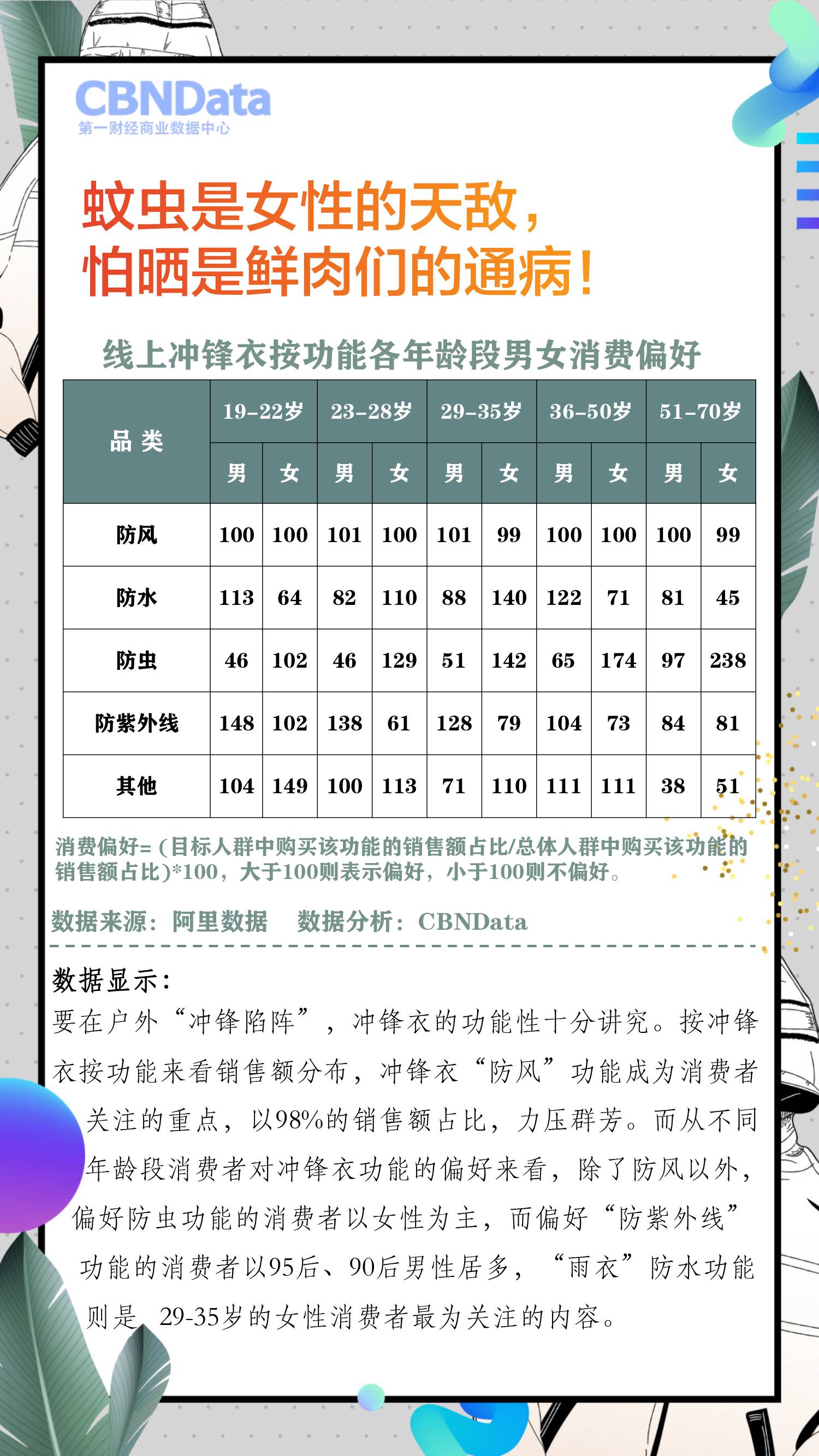 要在户外“冲锋陷阵”,冲锋衣的功能性十分讲究。根据CBNData《研究》显示,按功能来看冲锋衣销售额分布,冲锋衣的“防风”功能以98%的整体占比力压群芳。从不同年龄段消费者对冲锋衣功能的偏好来看,偏好“防虫”功能的消费者以女性为主,而偏好“防紫外线”功能的消费者以95后、90后男性居多。