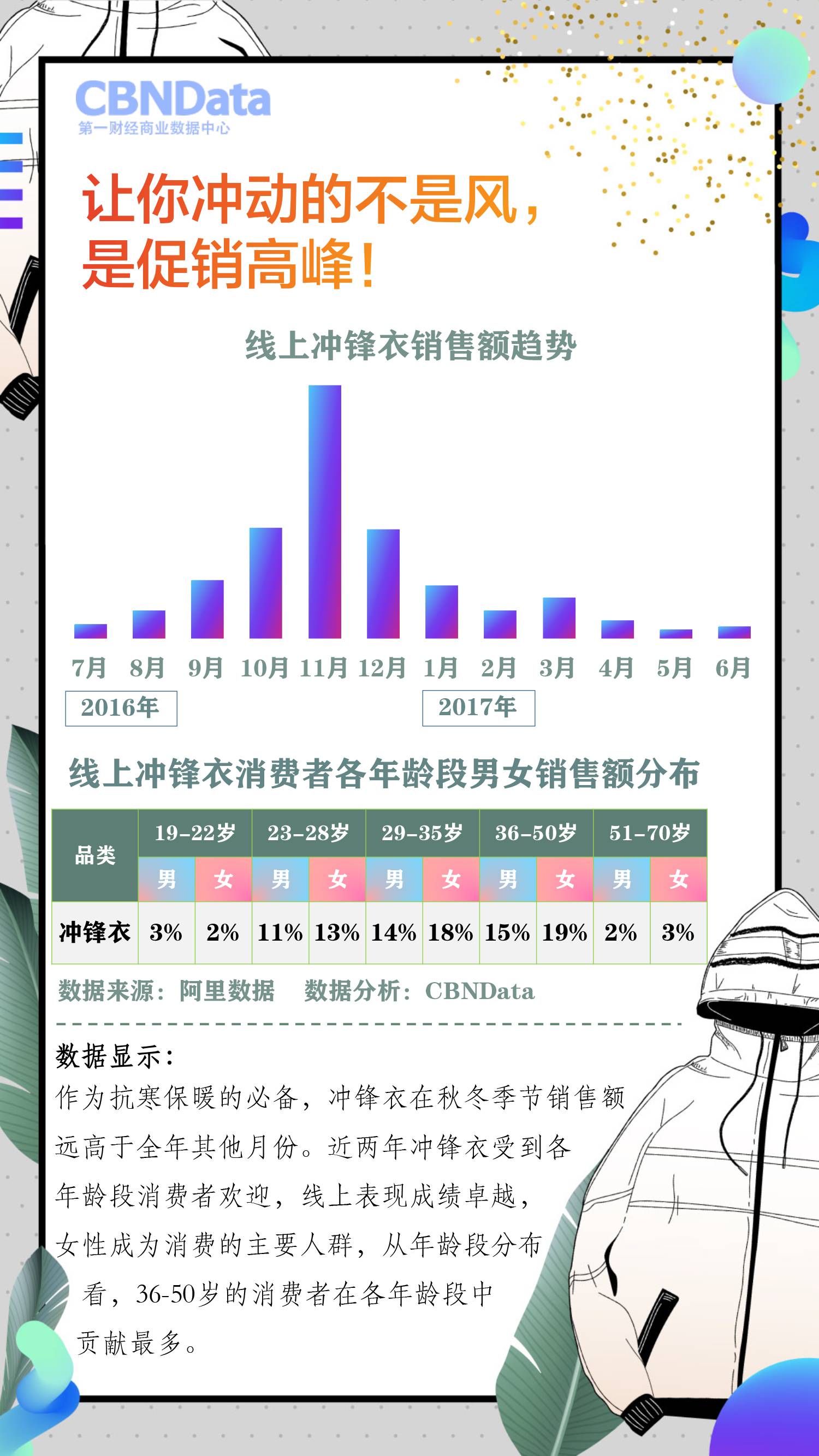 夏季防蚊防晒,推荐你穿冲锋衣;秋冬抗风抵寒,推荐你冲锋衣。不同的材质赋予冲锋衣不同的功效,以迎合消费者在不同气候时的需求。根据CBNData《研究》所显示的冲锋衣月销售额趋势来看,冲锋衣销售额从2016年7月开始见涨,并持续到同年的11月达到最高峰,随后在2017年3月又迎来一个小高峰。显而易见,吹呀吹呀,冲锋衣可能还在购物车;但是促呀促呀,消费者就立马下单坐等快递小哥!