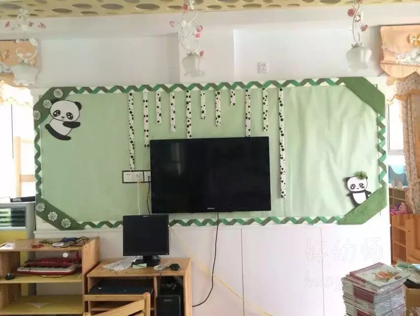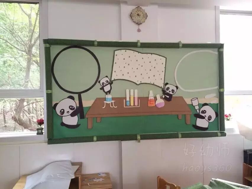 作品描述:我们幼儿园靠近南京市红山森林动物园,因此依靠得天独厚的地理资源,开展以红山动物园为载体的园本动物课程研究,每个班级有自己研究的动物。这是中班以熊猫为主题的环境创设,颜色以熊猫结合的绿色为主,整个班级是熊猫的研究动物。这是班级个别主题墙的局部图片。
