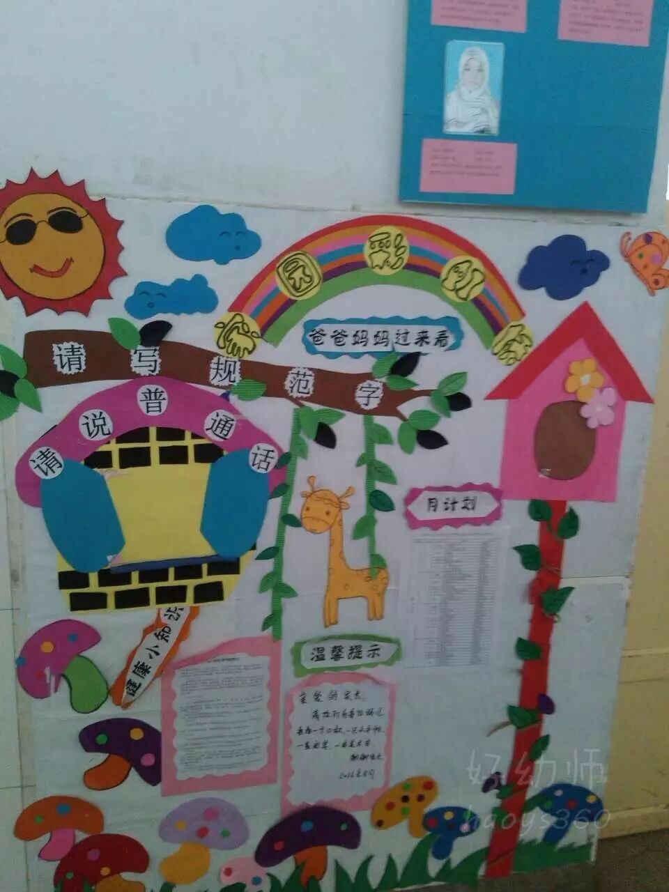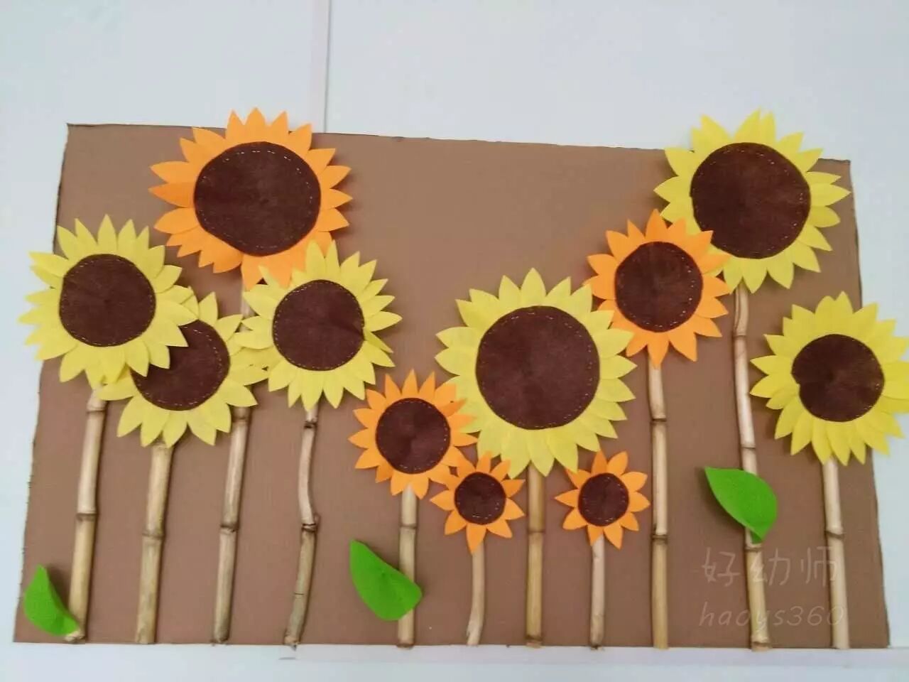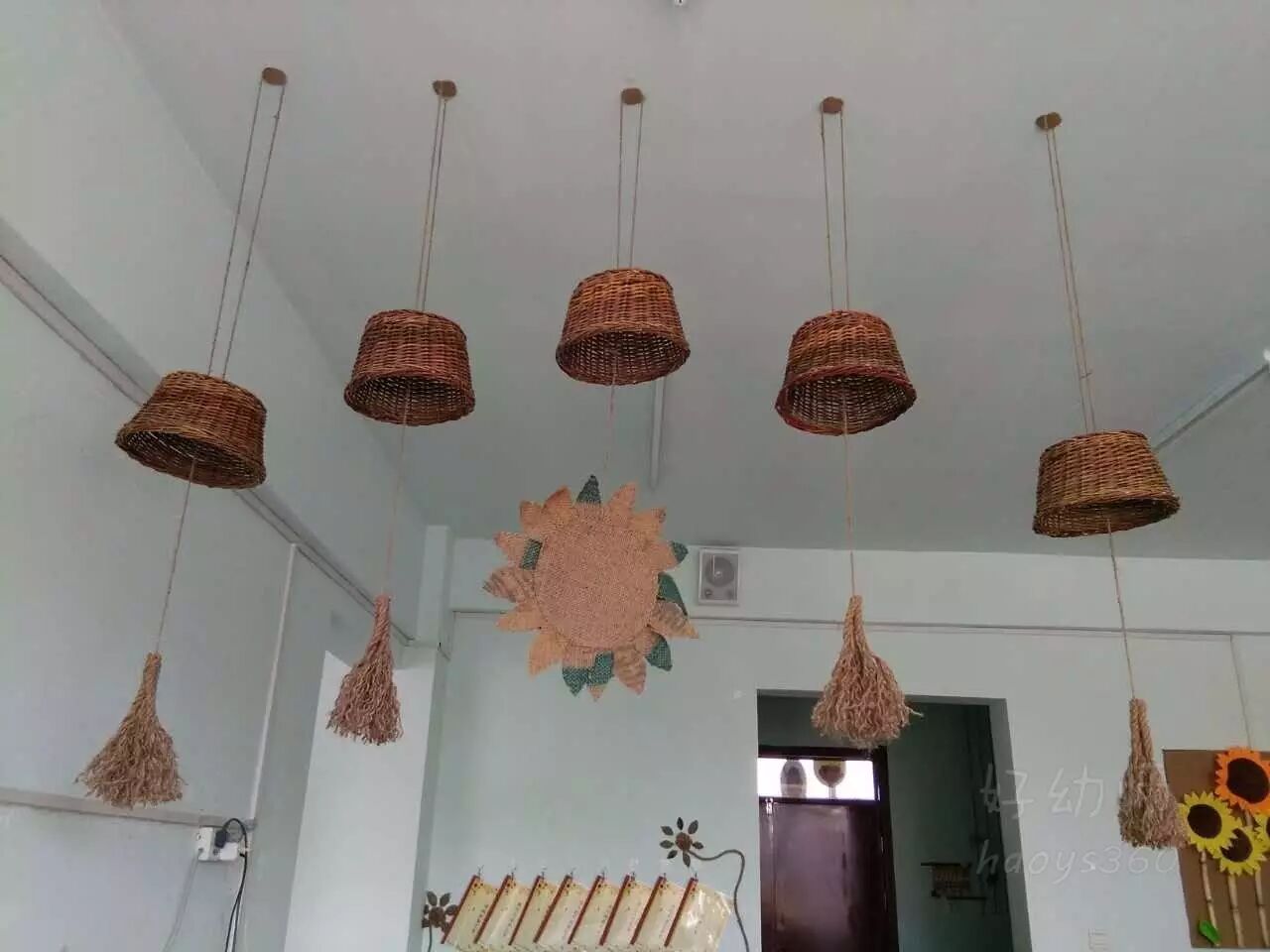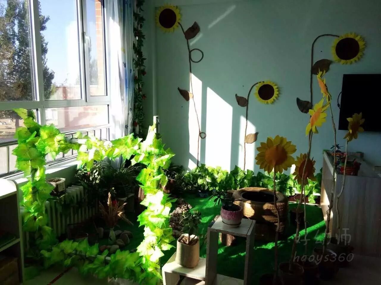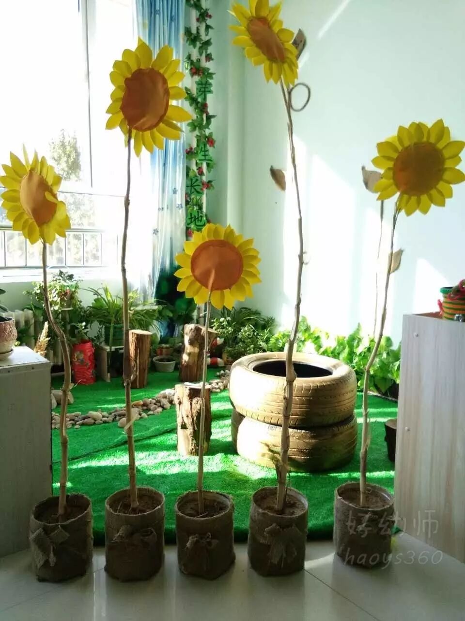 作品描述:向日葵又名朝阳花,指的是它开的像太阳一样,象征着温暖和希望,在世界的每个角落,有向日葵的地方总铺满了温暖,所以,我们班主题布置以向日葵为主,利用麻袋、麻绳、竹篮、草棍、玉米杆、美工材料来做布置,希望老师的爱心温暖着每一个孩子。