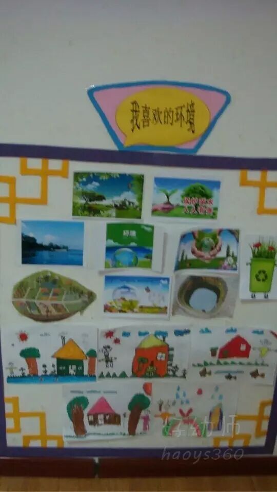 作品描述:保护环境,人人有责,从小做起,这是每个人都应该有的意识,本学期我设计了环保主题墙,通过搜集图片和各种标志,让幼儿知道生活中我们要节约用电,用水,减少污染,讲究卫生,保护环境,不随地吐痰,养成良好的卫生习惯,不乱扔垃圾,正确处理废弃物,对生活垃圾进行分类处理。植树造林,爱护身边的每一份绿地,每一株花草,每一片树林。地球只有一个,让我们共同珍惜,共同维护,使我们的家园呈现出碧水蓝天,鸟语花香,保护环境,就是保护我们自己。