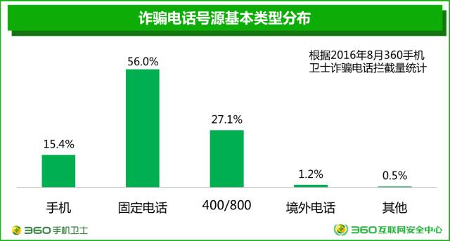 但《2016年中国电信诈骗形势分析报告》通过分析发现,在诈骗电话的号码源中,固定电话呼出的诈骗电话数量最多,占所有诈骗电话呼叫量的56.0%;其次是400/800电话,占比为27.1%;手机呼出的诈骗电话仅占诈骗电话呼叫总量的15.4%,甚至不及400/800号码的诈骗电的呼出量。