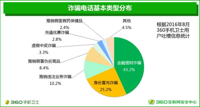 通过用户标记及吐槽信息统计发现,在用户接到所有诈骗电话中,虚假的金融理财诈骗最多,占43.2%;其次是身份冒充诈骗,占25.2%。