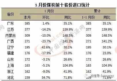 分省份看:1月份进口量排在前五位的省份为广东、江苏、内蒙、广西及辽宁。上述五省共进口煤炭合计1535万吨,环比下降7.1%,同比上升85.4%,上述五省进口煤炭总量占中国全部进口煤炭的61.6%。