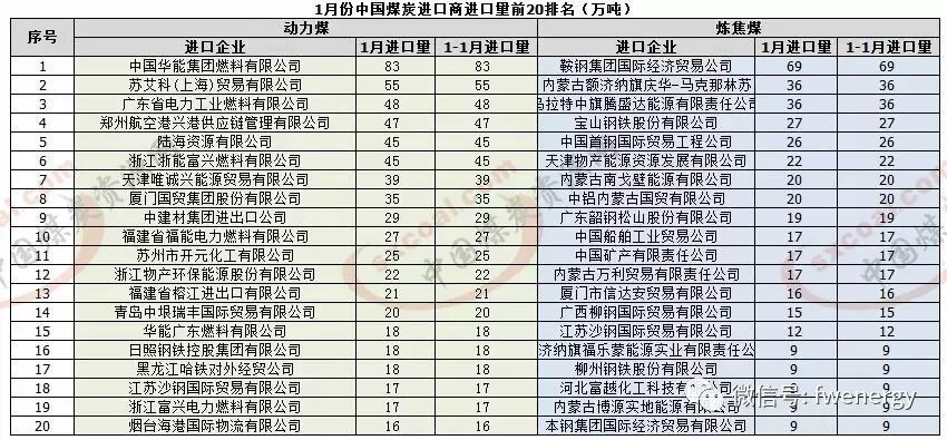 分进口企业看 在1月排名前20的动力煤进口商中,中国华能集团燃料有限公司、苏艾科(上海)贸易有限公司及广东省电力工业燃料有限公司跃居动力煤进口量前三的宝座。