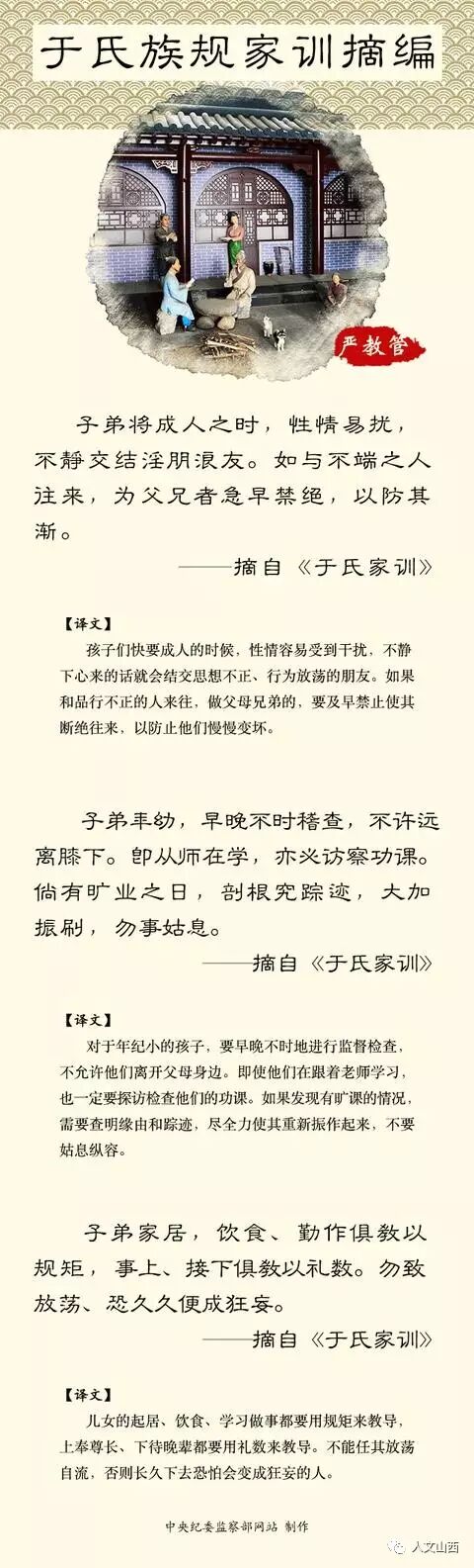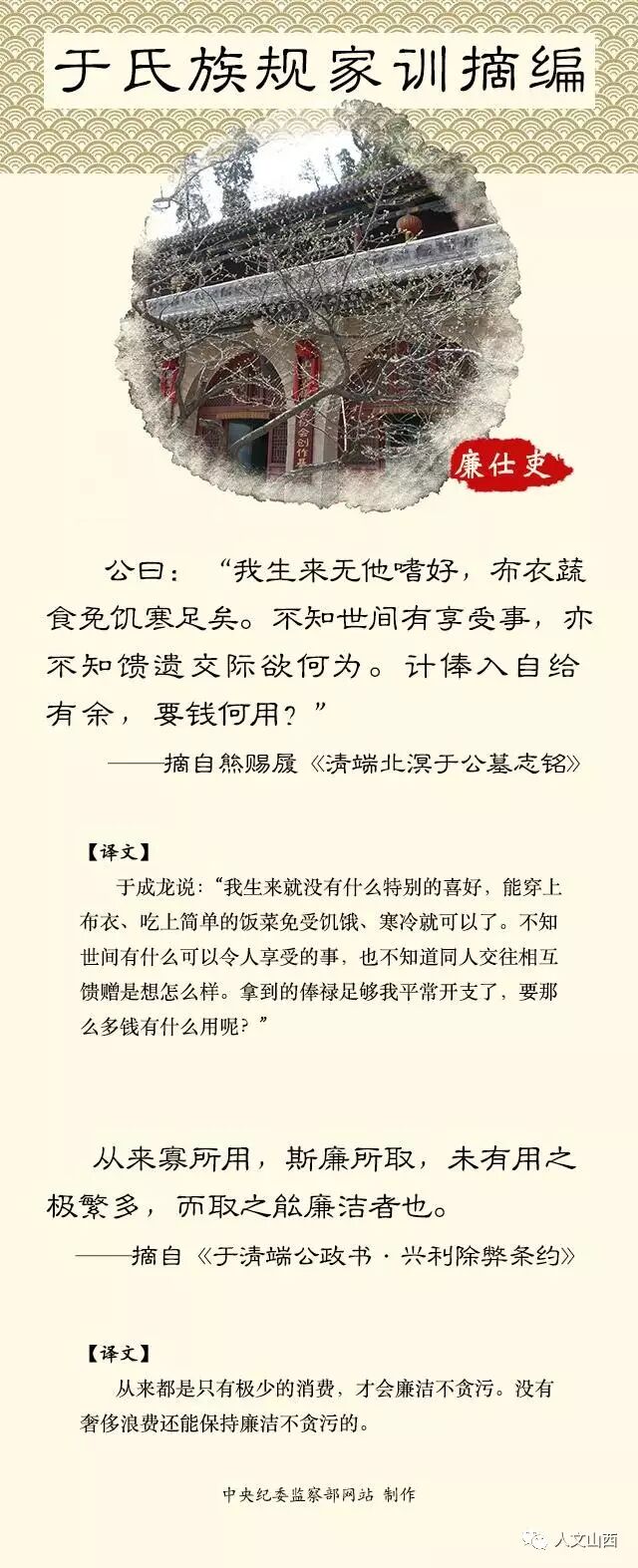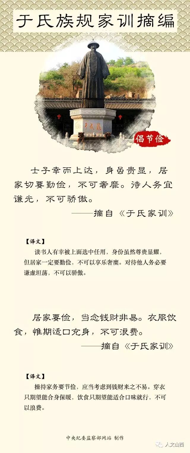 于成龙在他为官的20余年中,三次被举“卓异”,以卓著的政绩和廉洁刻苦的一生,深得百姓爱戴,被赞誉为“天下廉吏第一”。于成龙长孙于准,总结汲取于成龙等于氏先祖的家风家训,编订《于氏族规》22条,《于氏家训》41条,为吕梁于氏族人立下了世代践行的行为规范。