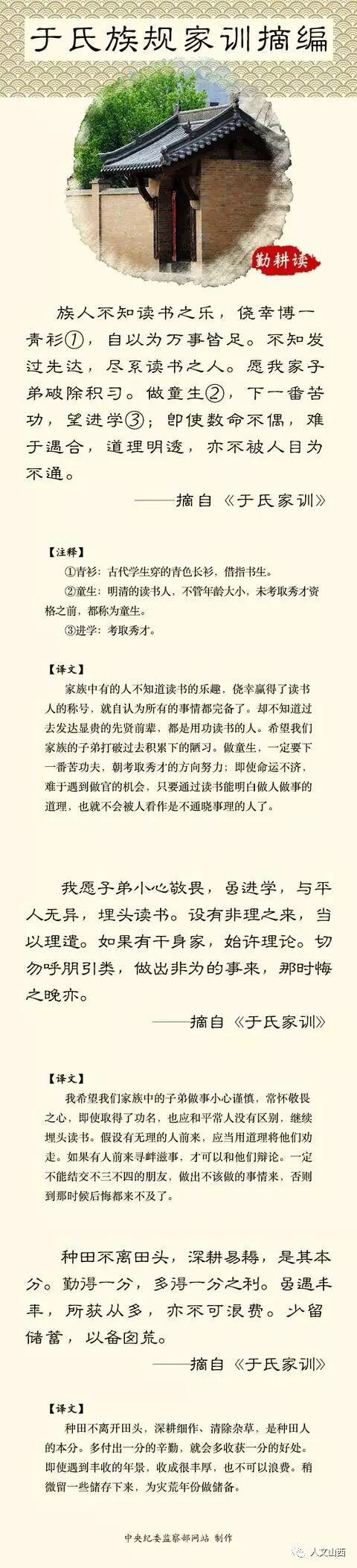 于氏族规家训以“勤耕读、尚节俭,循法礼、孝乡里,廉仕吏、存仁德”等为核心要义,涵盖“勤、俭、学、善、廉”等朴素道理,既是对于氏先祖良好品行的总结与传承,更是对后人行为规范的谆谆教诲和殷殷期盼。