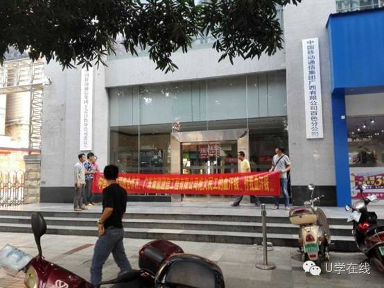 据网友爆料,广西某市移动公司办公大楼前,因某通信公司欠薪,合作施工人员到甲方办公大楼拉横幅抗议。有图有真相: