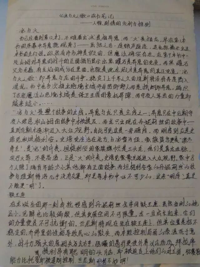于是我们看到黄人杰写了七篇《冰与火之歌》的读书笔记;吴新颜写了满满两张A4纸正反面的 “人物、剧情分析与推测”。