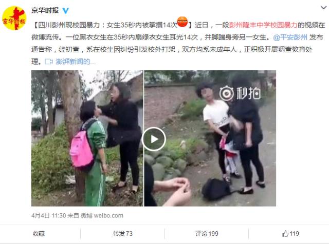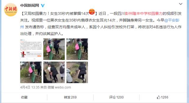 网传近日我市女学生被打视频,彭州警方高度重视及时介入调查,经初查系我市隆丰中学在校生因纠纷引发校外打架。目前视频中纠纷原因、双方参与者基本情况等已初步查实。因当事双方均系未成年人,我局与相关职能部门正积极开展调查教育处理中。,依法严惩一切危害学生安全的行为。再次感谢广大市民的关心和支持。