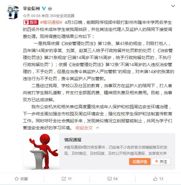 4月3日晚,前期网传视频中殴打彭州市隆丰中学两名学生的四名外校未成年学生被我局挡获,并在其法定代理人及监护人的陪同下接受调查处理。现将调查处理结果公布如下: