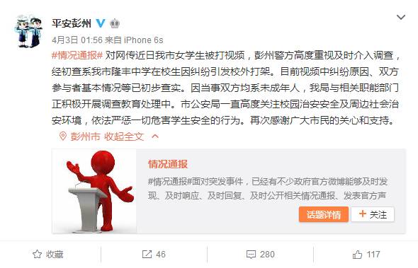 事情发生后,4月3日@平安彭州 在微博上回应了此事。