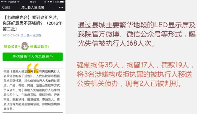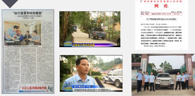 我院通过群众喜闻乐见的形式,在县电视台《法治灵山》栏目播出执行专题节目、利用报纸、微博、微信、门户网站等平台,全面展示一定时期内执行工作所采取的措施及其成效,进一步扩大影响,增强群众对执行难的理性认识,凝聚全社会理解执行、尊重执行、协助执行的广泛共识,推动形成良好的法治环境。