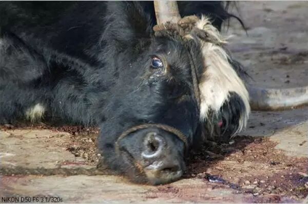 在这季节里,被宰杀的牦牛之多,可谓“血流成河”。当你目睹宰杀现场,真会让人毛骨悚然,不寒而栗!流淌的鲜血、屠夫手中血淋淋的刀、屠刀下牦牛绝望的眼神和垂死地挣扎、牦牛痛苦的呻吟声和断气时所发出的最后一声吼叫,更有拴在一旁,即将面临被宰杀的牦牛盈眶的泪水,这扑簌簌的泪水,不曾停息地流淌在一双双温顺无辜的牦牛的眼睛里,仿佛死不瞑目地述说着无尽的悲哀、恐怖与无助, 也片刻不曾停息地流进了诸佛慈悲的心海里。
