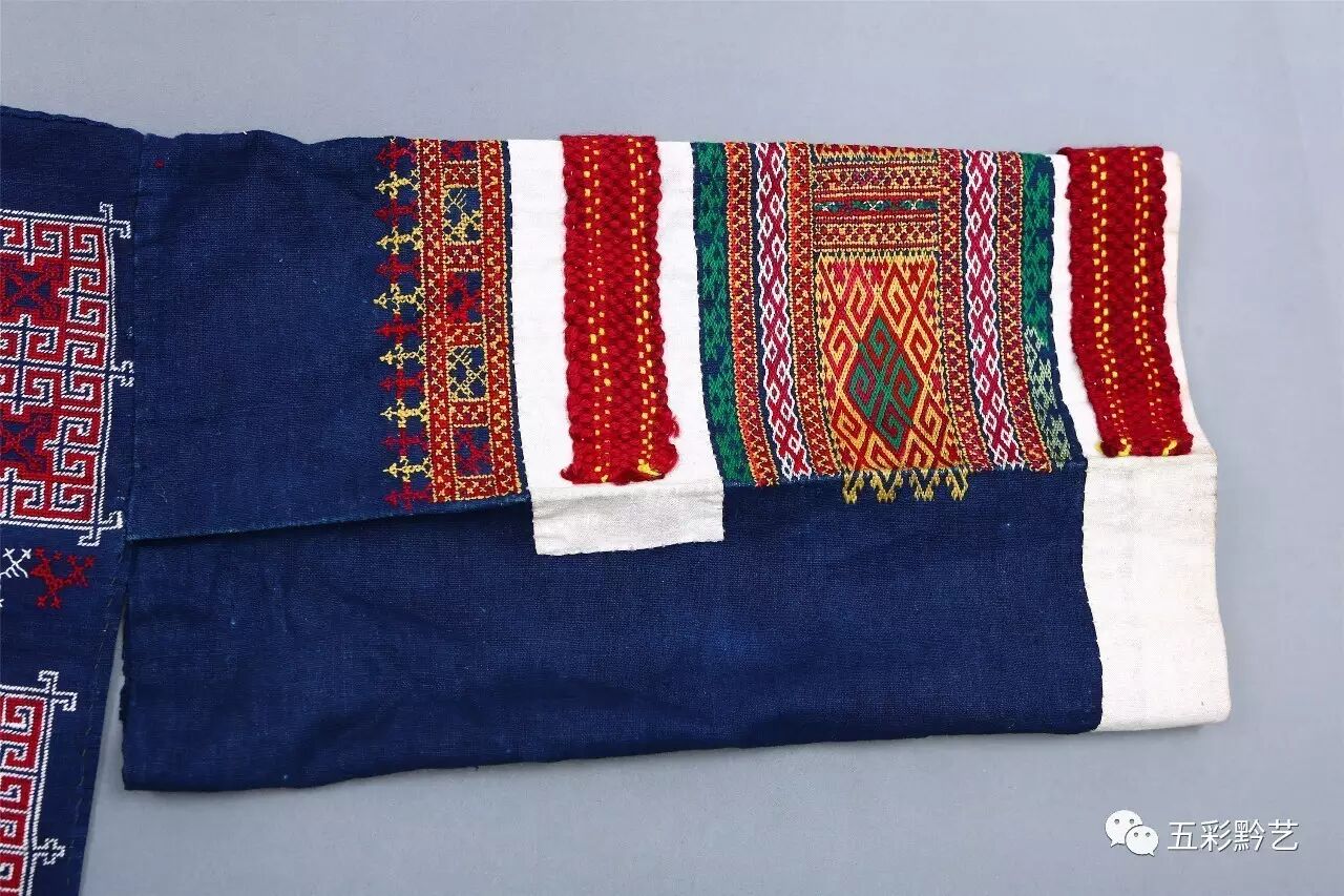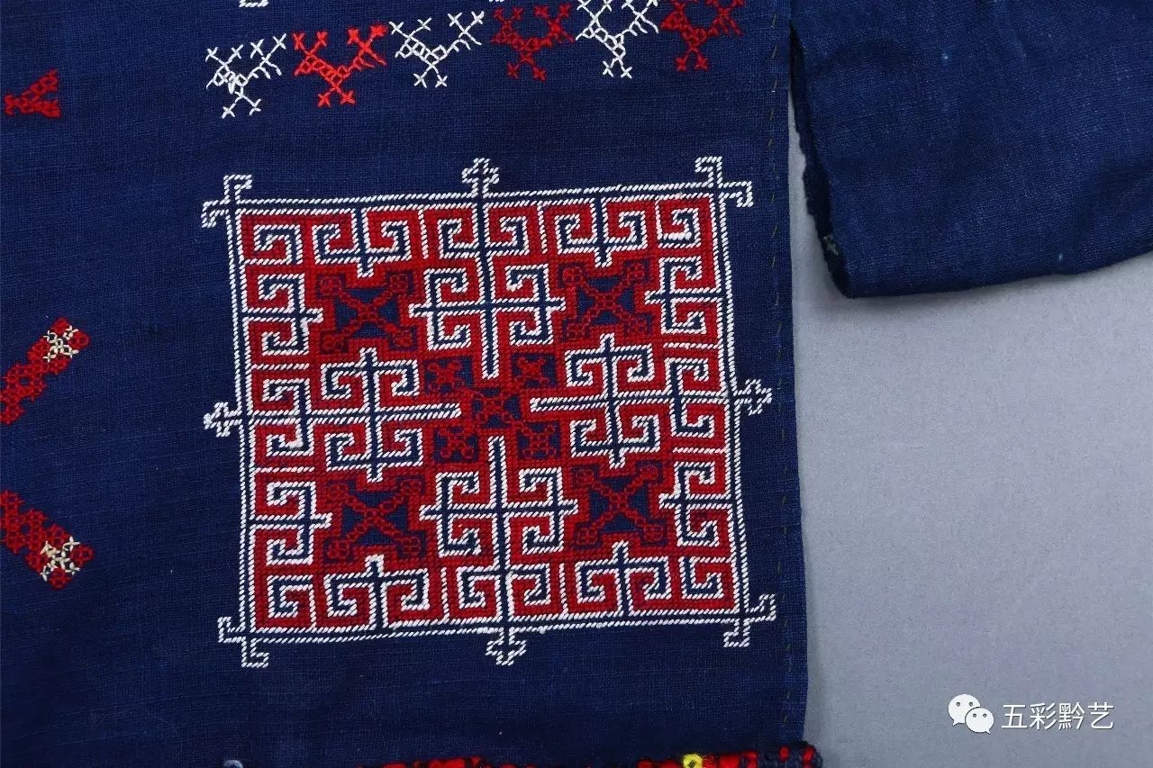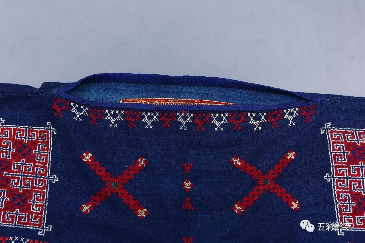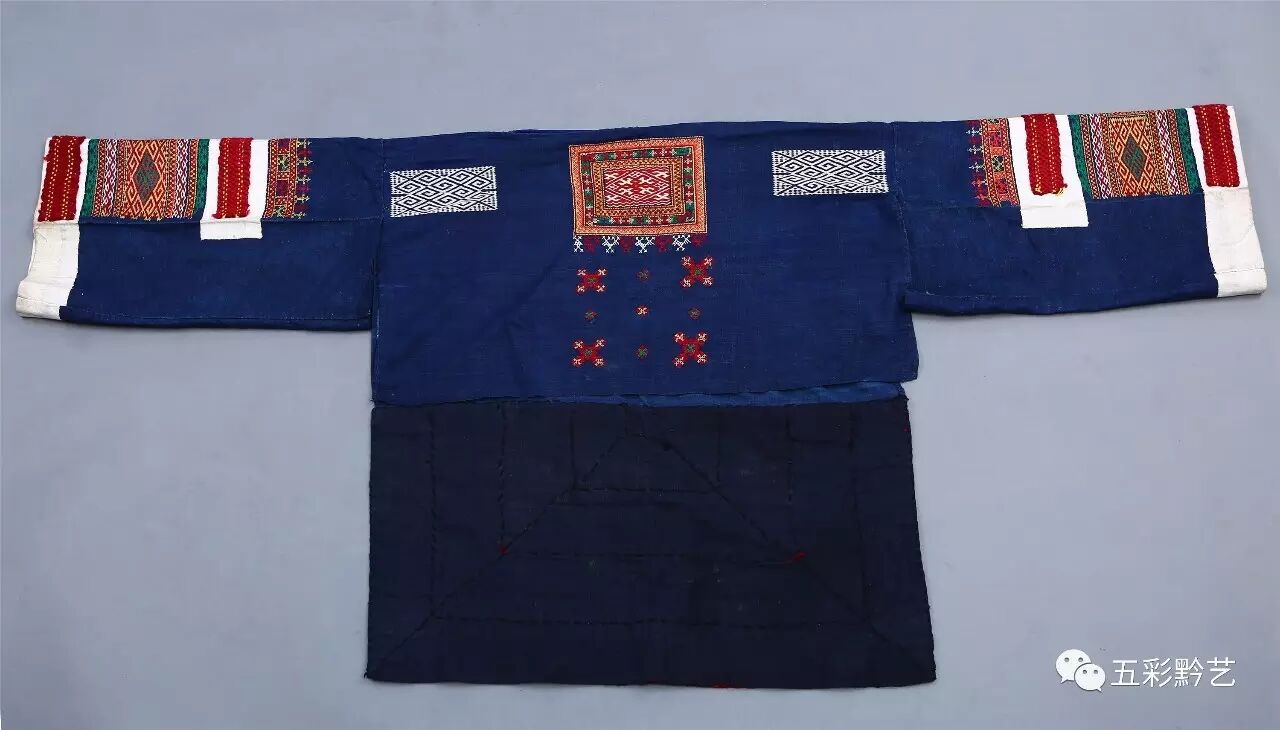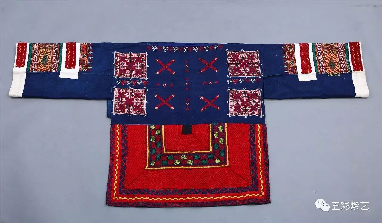 上衣为青布无领贯首衣,衣襟前短后长,双袖及前后衣襟上挑绣几何纹、方块纹和十字交叉纹,后衣襟缝接红色织锦半回纹衣片。