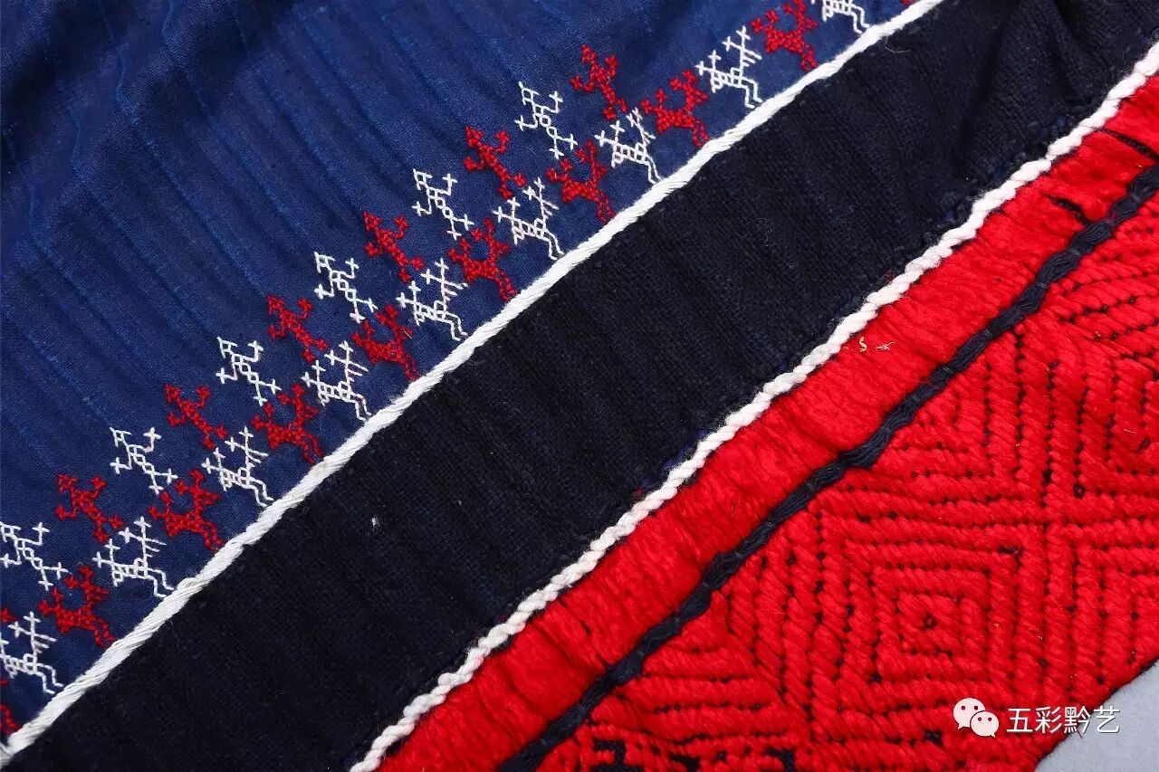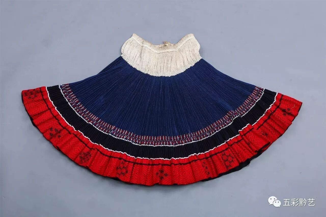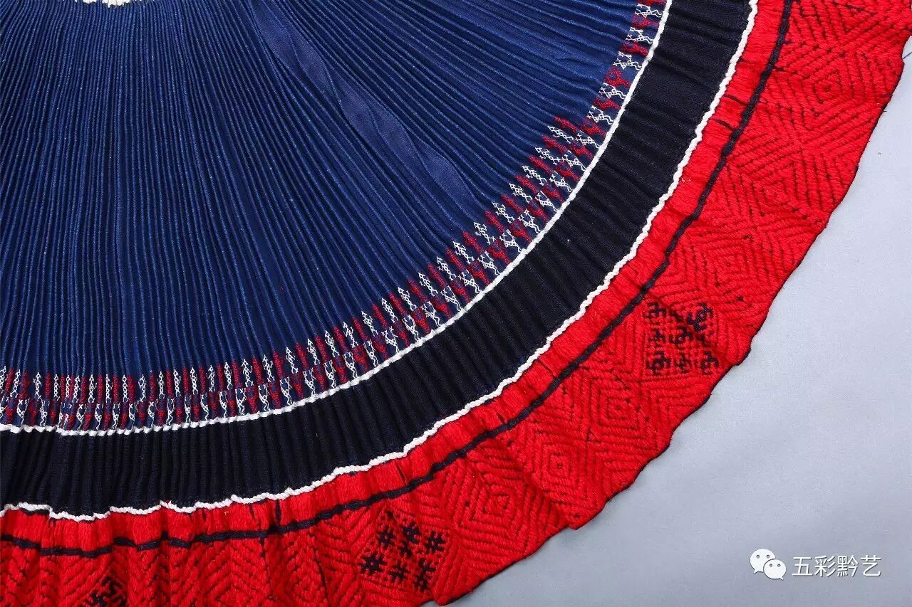 下装为家织青布百褶裙,裙摆下缝接红色织锦,并在上方挑绣代表支系的人字花。