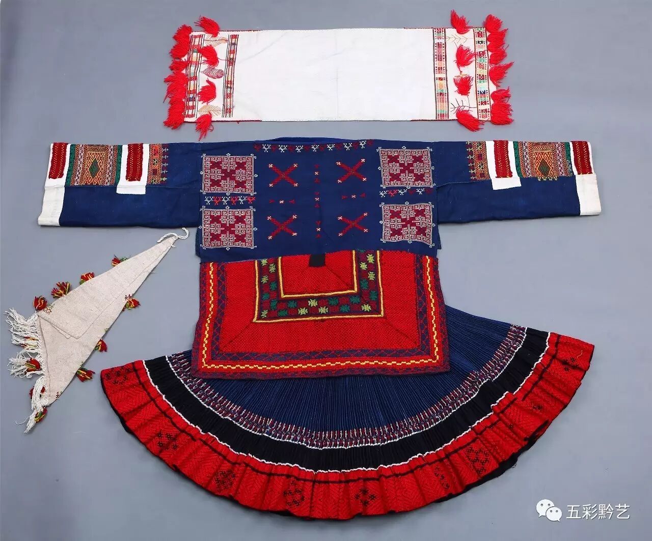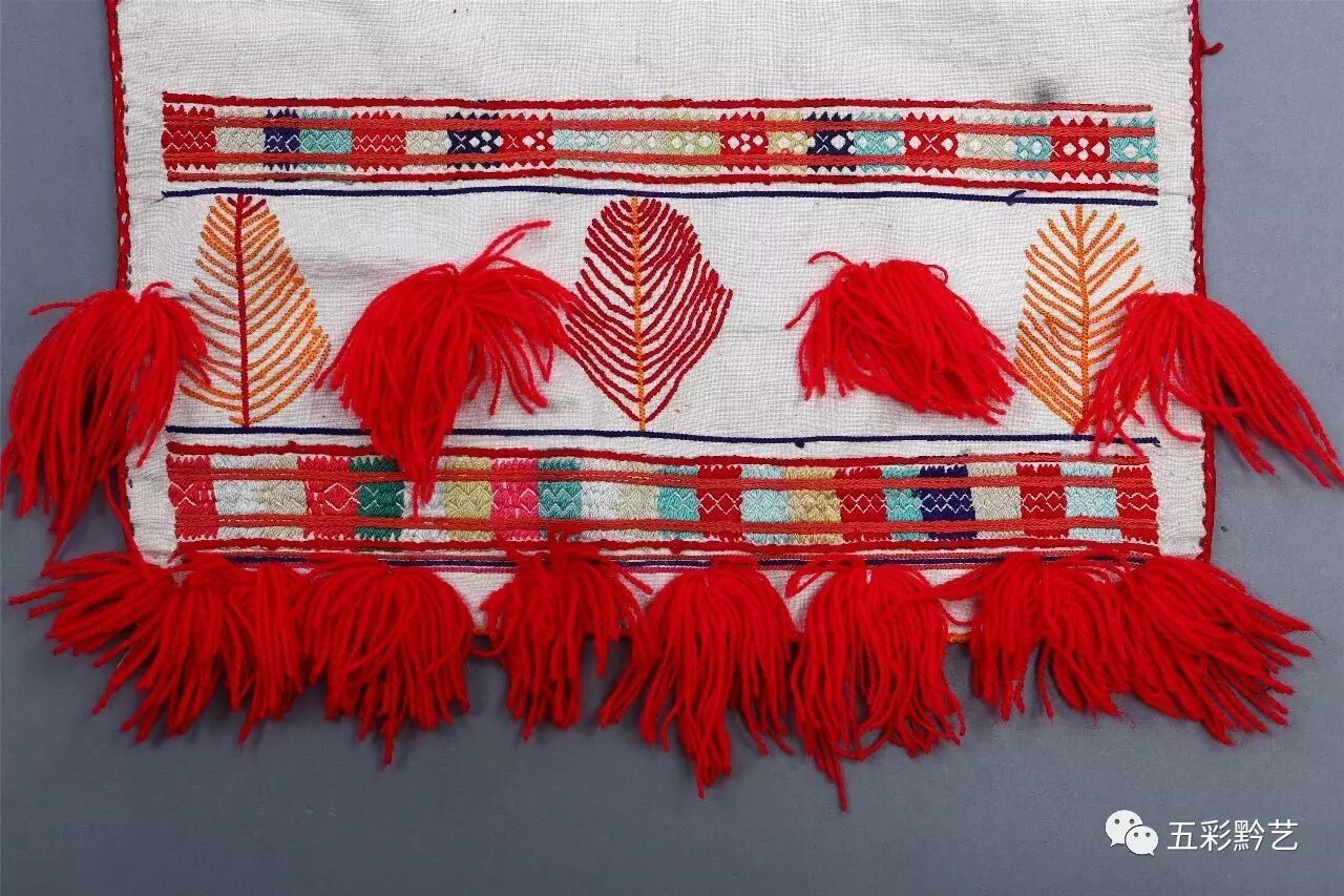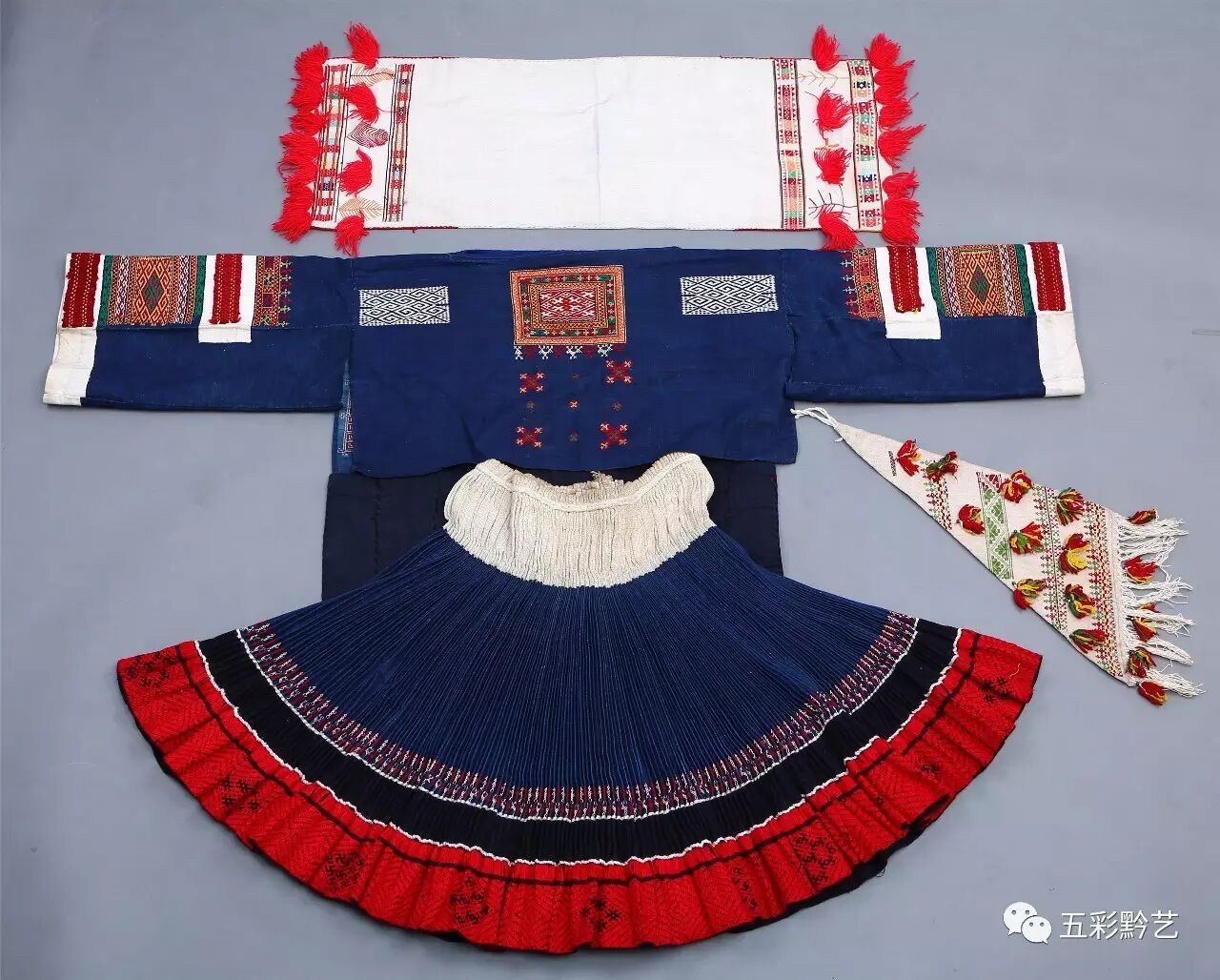 下装为家织青布百褶裙,裙摆下缝接红色织锦,并在上方挑绣代表支系的人字花。