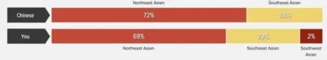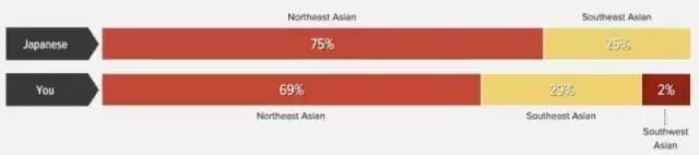 可以看出,日本人的东北亚基因比中国人更多,因而东南亚更少。因为在这次研究中没有把韩国作为一个样本国,否则我的基因和韩国一定比和日本更接近。