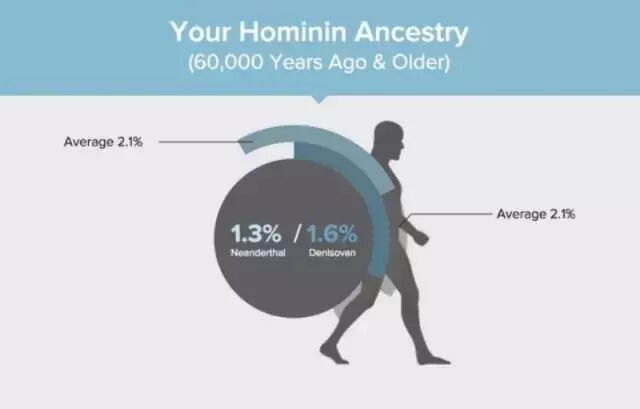 由于古人类和我们祖先的交配,今天除了呆在非洲老家的人之外的全世界所有的人身上都有1%-4%的古人类的基因。我也不例外,如图1,我身上有1.3%的尼安德特人基因和1.6%的丹尼索瓦人基因,参加测试的75万人的平均是分别是2.1%和2.1%,我低于平均的原因在于尼人主要在欧洲和中东一带活动,我的祖先在约6万年前就离开那里了,而尼人到3万年前才灭绝,所以留在那里没走的人们后来还有三万年的机会和尼人交配,那里的土著身上的尼人基因就会更高。丹尼索瓦人目前只在西伯利亚发现,我的祖先是从南方进入中国,因而我身上丹尼索瓦人基因也小于平均值。