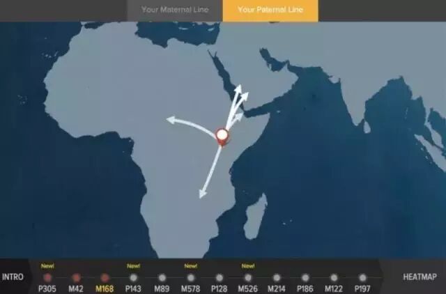 当人类走出非洲,在迁徙的过程中不断分支,每个分支都有自己独特的基因变异标记。第一个走出非洲的分支的基因标记就是M168。发生M168变异的男子可能生活在7万年前东北非大裂谷一带,也即今天埃塞俄比亚,肯尼亚,或坦桑尼亚。今天除非洲之外的世界上所有男人身上都带有M168 标记。