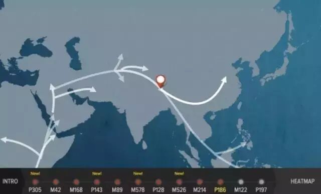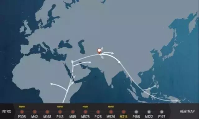 M214支兵分三路:北上进入中亚大草原(经土库曼斯坦,乌兹别克斯坦入哈萨克斯坦。这一支在北上后又分两支:一支向东经西伯利亚进入东亚(中国),另一只掉头向西到了欧洲斯堪的纳维亚半岛。另一支继续向东南去南亚,这一支中间又分出一支从云南进入中国。