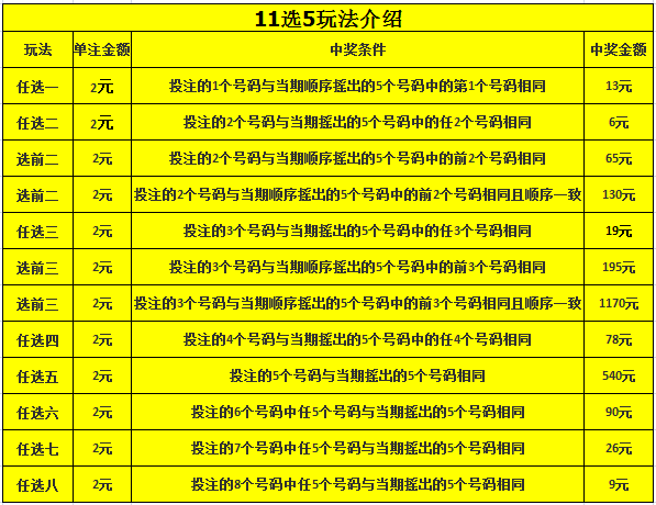 在介绍新玩法前,先科普下什么是体彩11选5。体彩11选5是中国体育彩票发行的高频数字彩游戏,每期电脑从11个号码中选出5个号码作为中奖号码,每十分钟1期,下面是11选5的游戏规则和派奖金额。