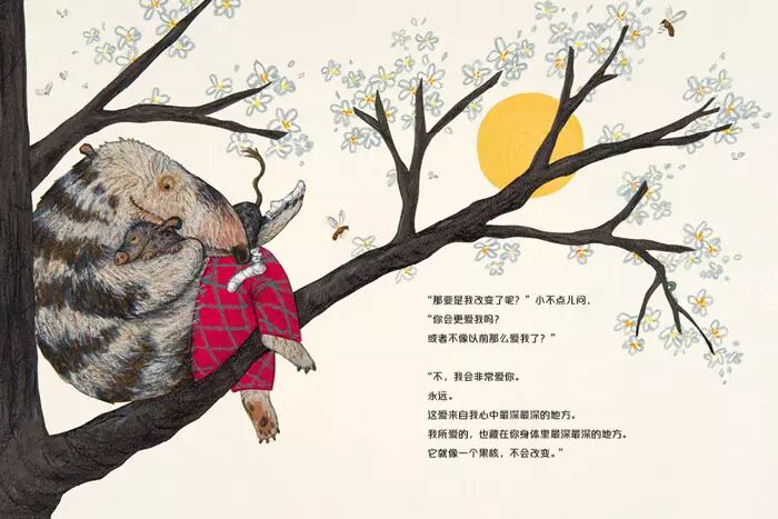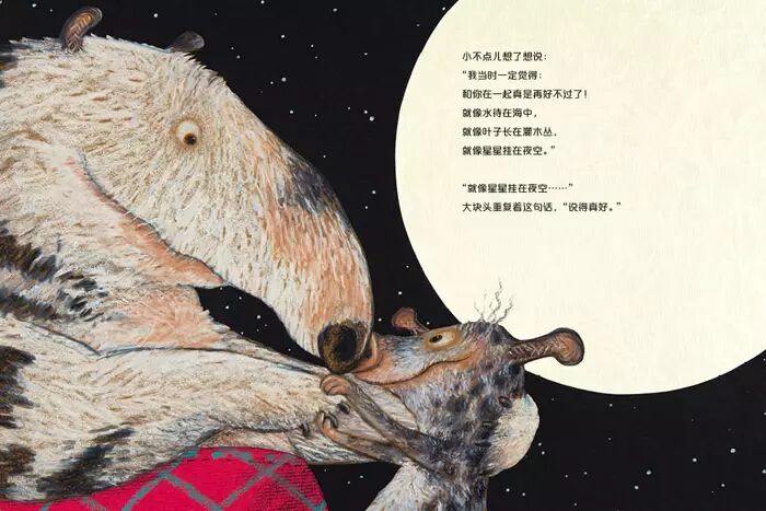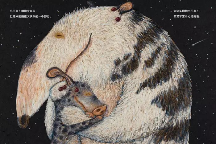 小不点儿那样小,小到只能抱住大块头的一小部分;大块头那样大,大到抱住小不点儿时要小心翼翼。但这丝毫不妨碍他们互相爱着对方,那种爱就像坚固的果核,永远不会改变。小不点儿想知道,开始是什么,当然,他想知道的是他与大块头爱的开始。小不点儿还想知道,是不是所有开始都有一个结束,当自己改变了,大块头还会爱他吗?