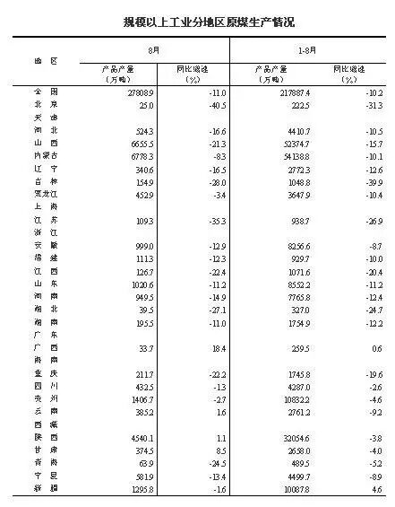 分地区看,1-8月份全国25个原煤生产省(区、市)中有23个产量同比下降,广西和新疆产量同比分别增长0.6%和4.6%。全国原煤产量最大的三个地区:内蒙古产量5.4亿吨,占全国24.8%,同比下降10.1%;山西产量5.2亿吨,占24.0%,下降15.7%;陕西产量3.2亿吨,占14.7%,下降3.8%。